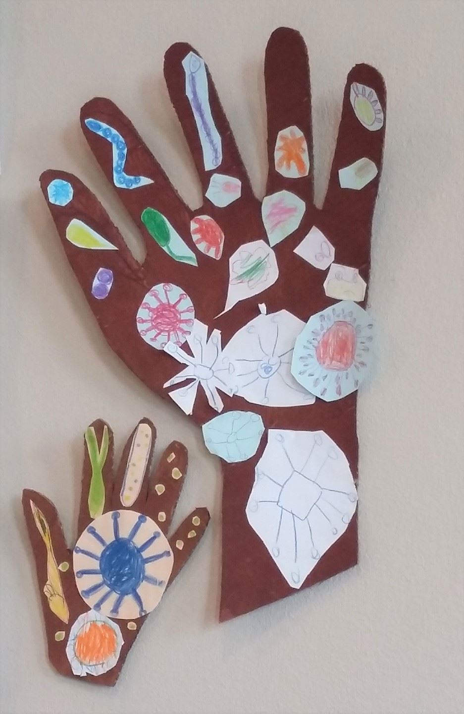 Den siste tiden har vi på stjerne gjort aktiviteter og snakket om Coronaviruset. Vi har blant annet tegnet virus og bakterier, klippet ut og limt det på en stor hånd laget av papp.