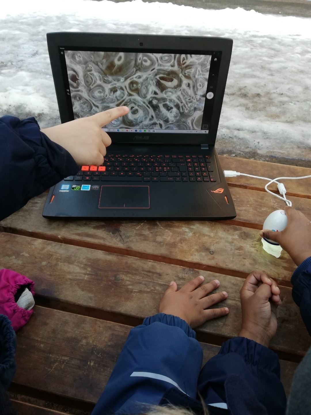 Mikroskopet og datamaskin ble tatt med ut for å studere det vi omgir oss med. Vi startet med å se på hårstrå. Dette var det noen av barna syntes så ut som en edderkopp. Vi studerte luer og votter. Deretter skrubbsår og føflekker barna hadde på hendene før vi gikk videre til ting vi kunne finne ute.