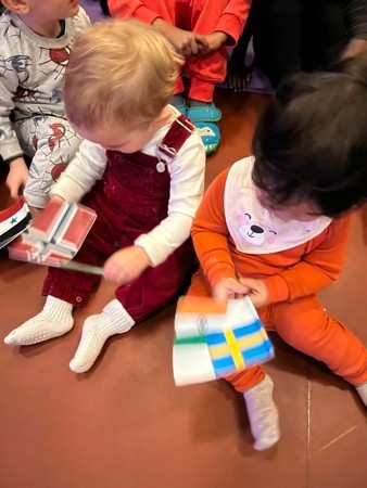 Barna syntes at lek med lys og skygge var spennende og lagde mange lyder underveis, spesielt da nye figurer kom på "scenen". Spenningen var så stor at noen ganger kunne de ikke høre på figurenes stemme og da måtte de voksne snakke veldig høyt :) Det at mange barn pekte på scenen og ropte underveis var et godt tegn på at de var fokuserte og ønsket å delta i fortellingen. Vi avsluttet markeringen med fine sanger som "seks små ender kjenner jeg" og "alle trenger en liten venn" for å understrekke denne mangfoldige opplevelsen. Under samlingen holdt barna i tillegg på et flagg med både det norske flagget og flagget fra deres bakgrunn. Både store og små hadde en fin dag preget av mangfold, god mat (alle elsker jo pizza) og følelser av felleskap.