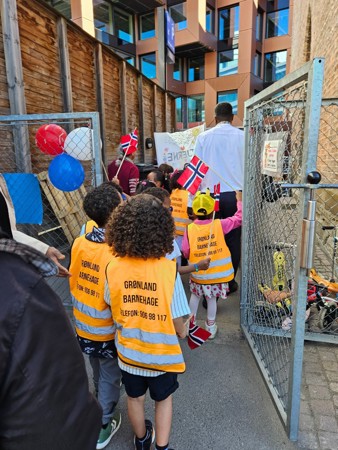 Først gikk vi i tog sammen med Lille Grønland og Mosaikk barnehage. Mange foreldre gikk sammen med oss og det var veldig hyggelig.