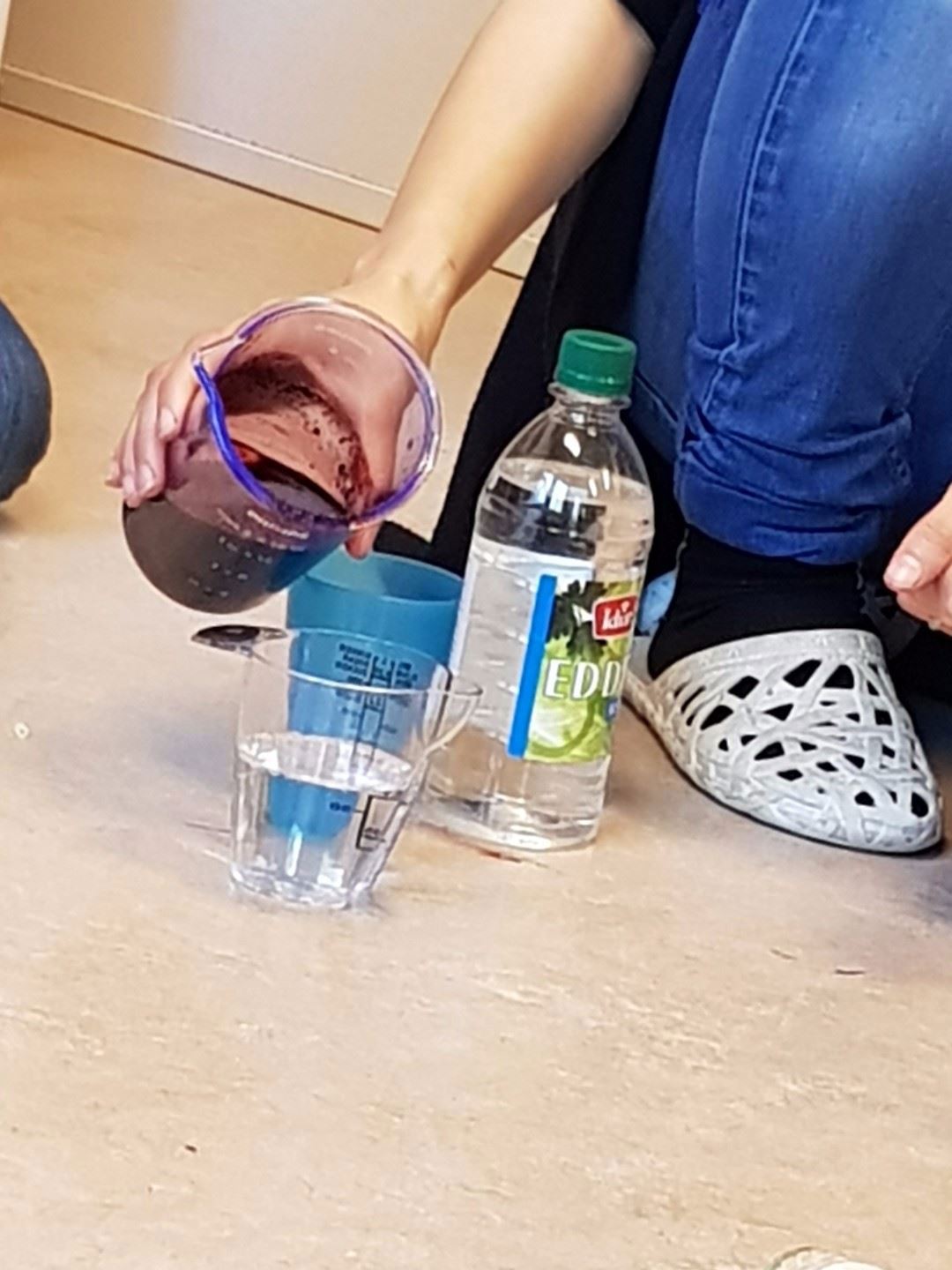 Å blande eddik med blåbærsaften ga for eksempel en rød farge. Oppvaskmiddel ga en brun farge og når vi blandet kun med vann så fikk vi en blålilla farge.